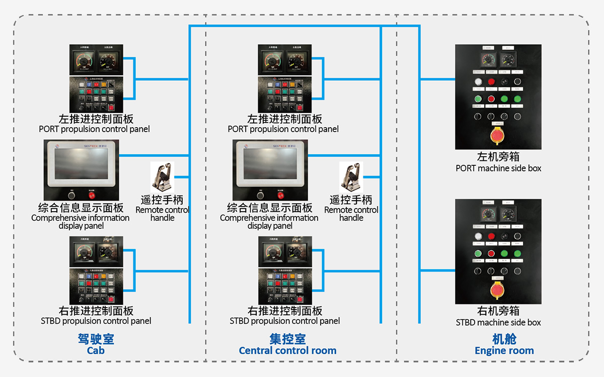 遙控系統由機旁控制、駕控控制、電池系統控制及綜合監控系統組成,整套遙控系統和電力推進系統基于PLC控制單元和現場總線網絡相結合,實現船員對于整船動力的人機交互和控制功能,可以通過不同站點實現對推進電機的啟停、調速控制,以及各站點的操作切換,同時可以實時監控船舶推進系統各個設備的運行狀態、報警信息。
