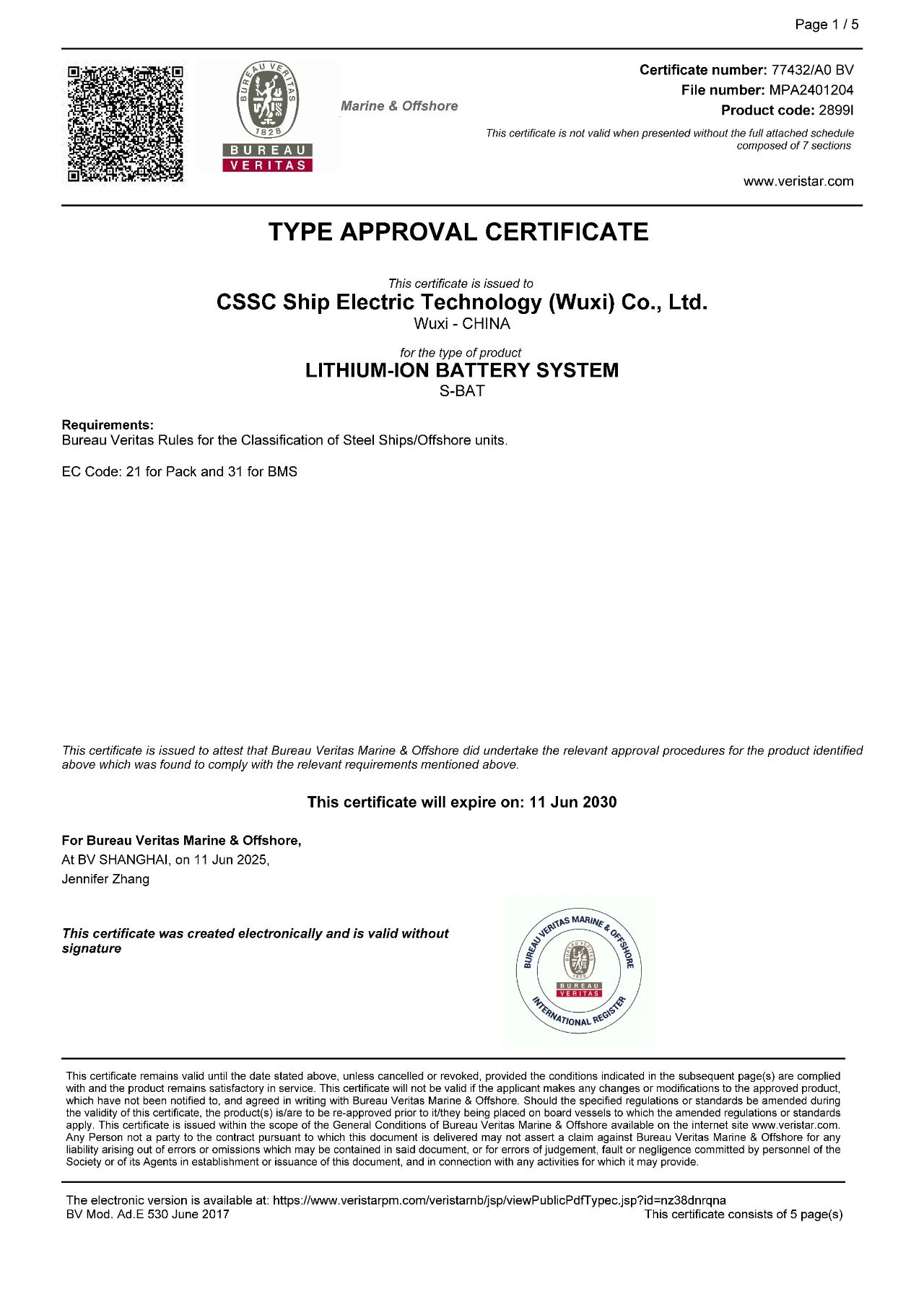中船賽思億磷酸鐵鋰電池系統順利取得法國船級社(BV)型式認可證書!