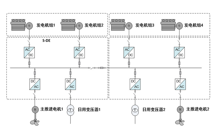 柴油機(jī)組為動(dòng)力源,推進(jìn)電機(jī)驅(qū)動(dòng)推進(jìn)器